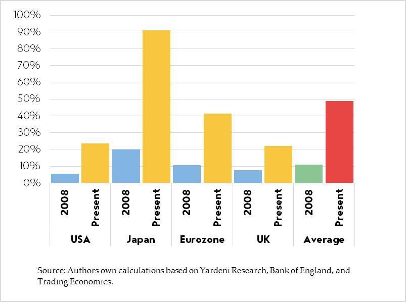 Following the path of the world’s leading central banks, Draghi went on to pump €2 trillion of newly created money into financial markets. To date, the world’s major central banks have expanded the size of their balance sheet at a rate not seen since World War II (see graph below). They have created over $15 trillion of new money through their quantitative easing (QE) programmes, pouring this money into the financial sector the name of ‘maintaining price stability’.