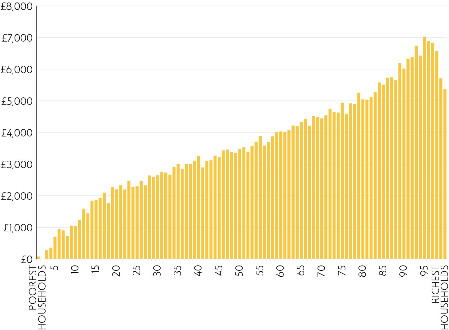 The personal allowance is designed to protect an individual’s initial income from personal taxation (although earnings from work below this level can still accrue liabilities under national insurance contributions) and is scheduled to apply to the first £12,500 in income for the 2019/20 financial year. But those families with little or no taxable income, who make up the majority of the UK’s poorest households, by definition miss out on the benefits of a higher tax allowance altogether. Meanwhile, families with two or more people receiving a taxable income – which tend to be higher up the income distribution on average – can receive twice the benefit or more. On top of this, the personal allowance is also worth double for individuals with pre-tax incomes above the ‘higher rate threshold’ – the level beyond which additional income gets taxed at a rate of 40%, and set at £50,000 for 2019/20. This is because the higher rate threshold is defined as a specified amount above the personal allowance, so the threshold rises pound-for-pound automatically for any increase in the allowance. However, gains for the richest 5% of households are limited by the fact that the personal allowance is gradually withdrawn for annual incomes above £100,000.