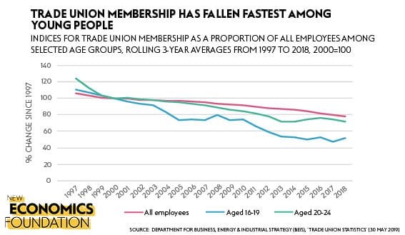 Despite the recent uptick, the proportion of 16-19 year olds who are members of a union has halved since 1995