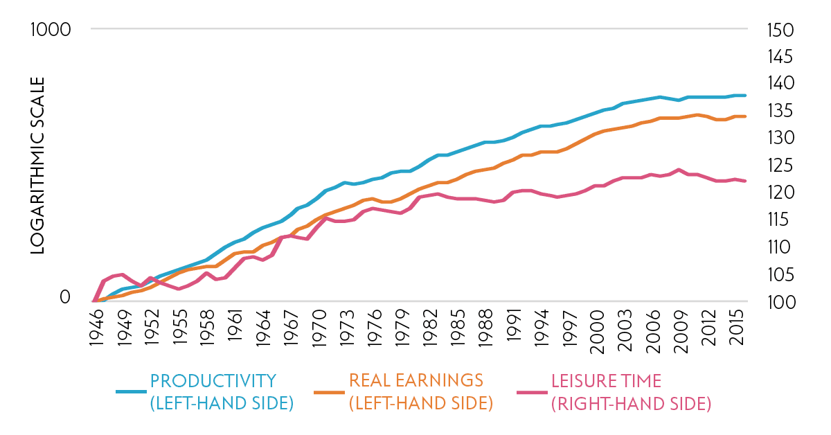 The analysis shows that during the decades up to the 1970s, a constant rate of increase in productivity has been associated with equally consistent increases in both earnings and leisure time. But since the 1980s, increases in leisure time peel off into comparative stagnation without a faster increases in earnings to compensate.