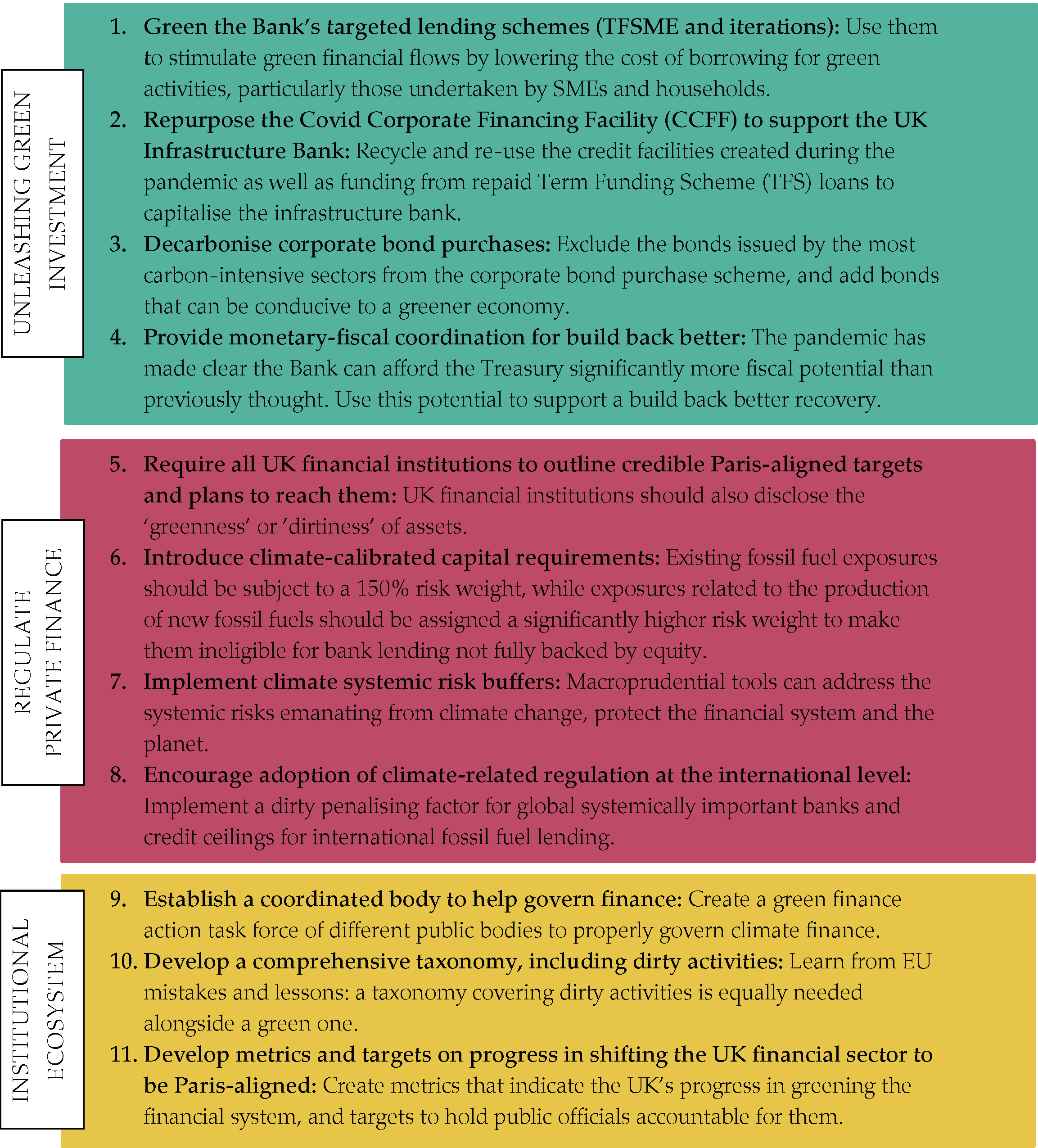 - With a new green mandate, the Bank of England has no excuse not to take action to stimulate green financial flows and regulate unsustainable private financial flows. But it cannot go at it alone; it will need to closely collaborate with public bodies and elected officials.