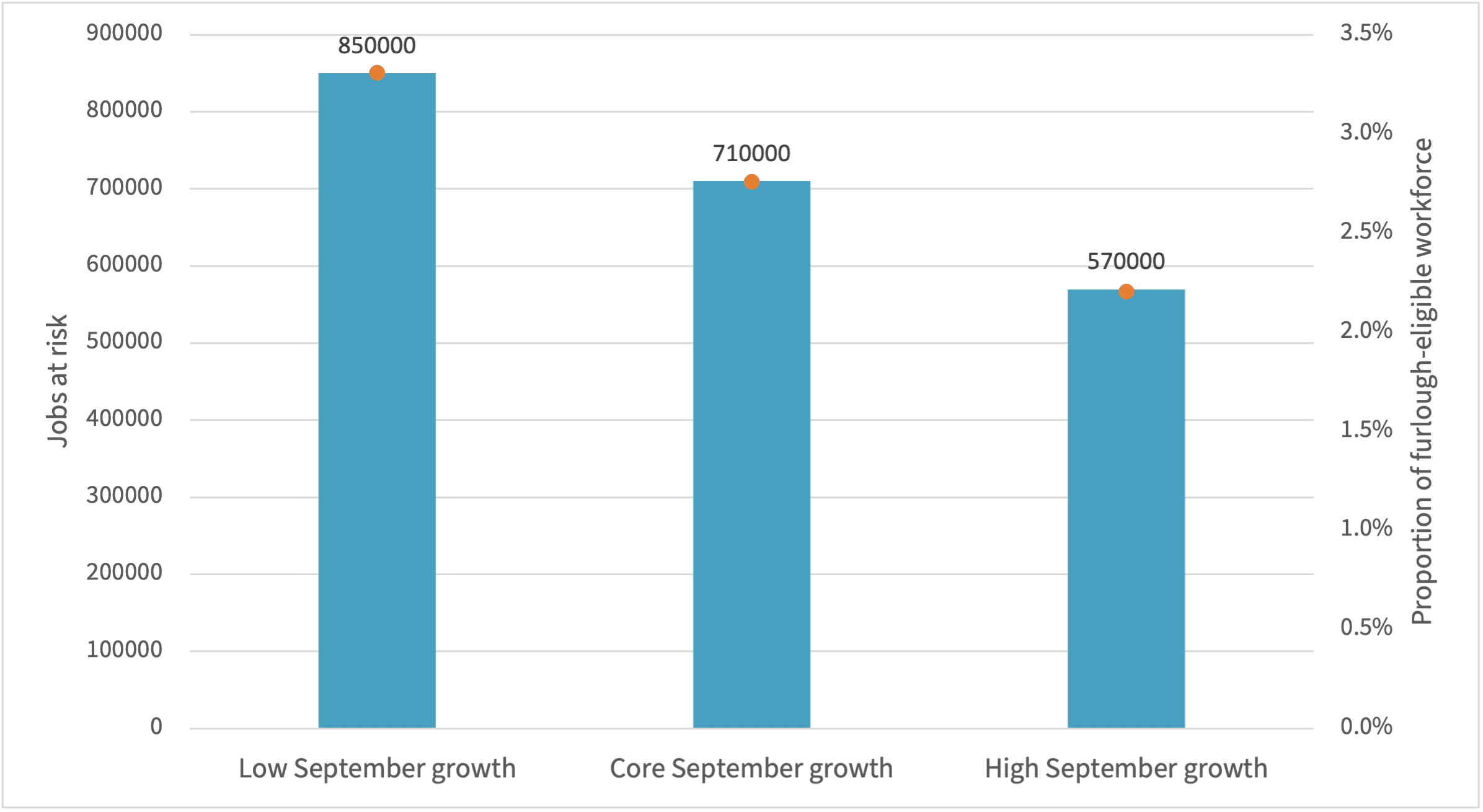 NEF model estimates of jobs at risk at the end of September as a result of the winding down and closing of the Coronavirus Job Retention Scheme, derived from analysis of the relationship between GDP, business turnover, and furlough demand and forecast forward using HM Treasury-compiled GDP forecasts adjusted to account for recent indicators of GDP growth