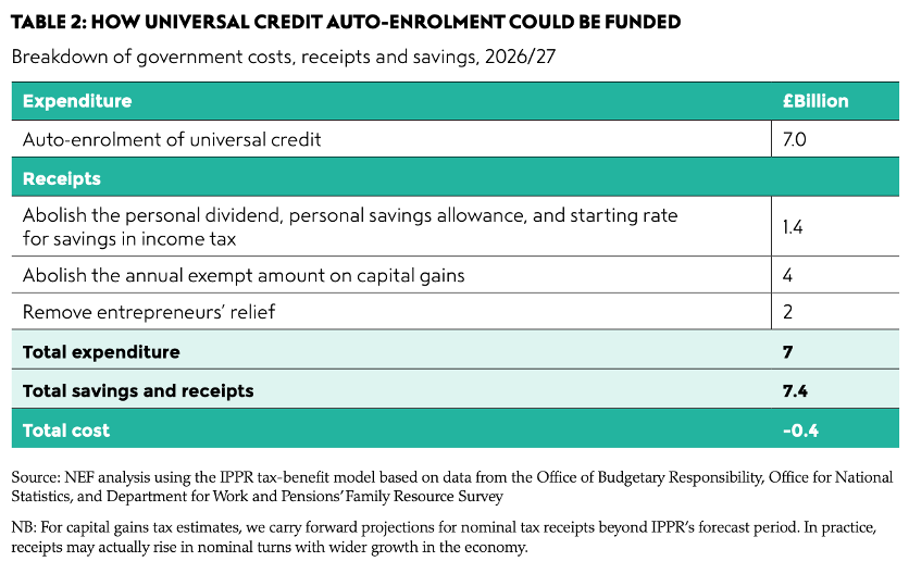 NEF modelling shows that a more automated system that ensures everyone receives the payments they are entitled to would cost an additional £7 billion once UC is fully rolled out in 2026/27. NEF proposes this should be funded by rebalancing the share of tax towards income from wealth. We recommend effectively abolishing both the annual exempt amount in capital gains tax and the so called ‘entrepreneurs relief in in capital gains, raising a combined £6 billion a year. Effectively abolishing the tax-free allowances in income tax on personal savings and dividends would raise a further £1.4 billion a year.