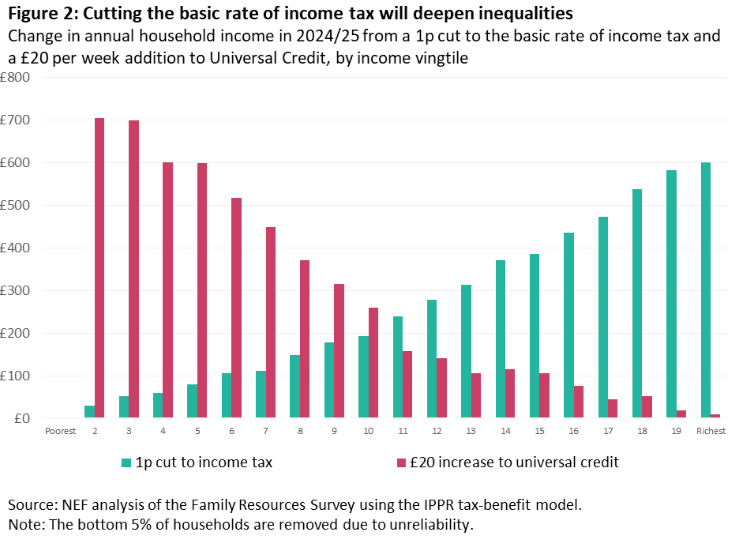 Cutting the basic rate of income tax by 1p would deepen inequalities, with higher income households gaining 10 times more than the bottom quarter, according to analysis from the New Economics Foundation published today.