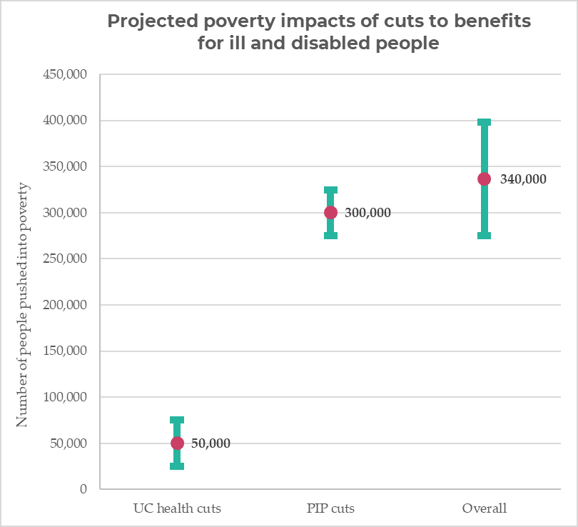 When it comes to the effect of these cuts on poverty, discerning the true impact is difficult. The Department for Work and Pensions’ (DWP) impact assessment suggests that the changes to the PIP assessment will push 300,000 people into poverty, while the cuts to the UC health top-up will have this effect on 50,000 people. However, these figures are (unhelpfully) rounded to the nearest 50,000, meaning the actual impact of each of these changes could be 25,000 either side. Furthermore, the document flags that the two cuts will impact some of the same people, which means we can’t simply add these two figures together.